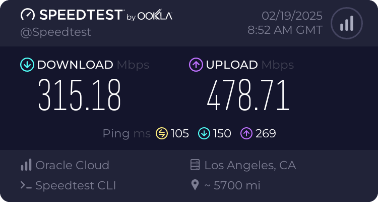 ---------------------------------------------------------------------- CPU Model : AMD EPYC 7551 32-Core Processor CPU Cores : 2 @ 1996.250 MHz CPU Cache : 512 KB AES-NI : ✓ Enabled VM-x/AMD-V : ✓ Enabled Total Disk : 47.1 GB (14.0 GB Used) Total Mem : 947.5 MB (200.5 MB Used) Total Swap : 2.0 GB (67.9 MB Used) System uptime : 183 days, 1 hour 27 min Load average : 0.27, 0.39, 0.34 OS : Ubuntu 22.04.5 LTS Arch : x86_64 (64 Bit) Kernel : 6.5.0-1026-oracle TCP CC : cubic Virtualization : KVM IPv4/IPv6 : ✓ Online / ✗ Offline Organization : AS31898 Oracle Corporation Location : Minoh / JP Region : Osaka ---------------------------------------------------------------------- I/O Speed(1st run) : 52.4 MB/s I/O Speed(2nd run) : 53.4 MB/s I/O Speed(3rd run) : 51.1 MB/s I/O Speed(average) : 52.3 MB/s ---------------------------------------------------------------------- Node Name Upload Speed Download Speed Latency Speedtest.net 229.54 Mbps 60.83 Mbps 12.07 ms Dallas, US 468.11 Mbps 384.79 Mbps 147.35 ms Montreal, CA 411.68 Mbps 330.84 Mbps 196.86 ms Paris, FR 334.96 Mbps 284.63 Mbps 231.39 ms Amsterdam, NL 262.46 Mbps 346.95 Mbps 244.72 ms Beijing, CN 411.13 Mbps 299.37 Mbps 194.69 ms Shanghai, CN 411.45 Mbps 258.69 Mbps 184.90 ms Hong Kong, CN 4.03 Mbps 1.64 Mbps 45.72 ms Tokyo, JP 484.36 Mbps 338.48 Mbps 9.62 ms
