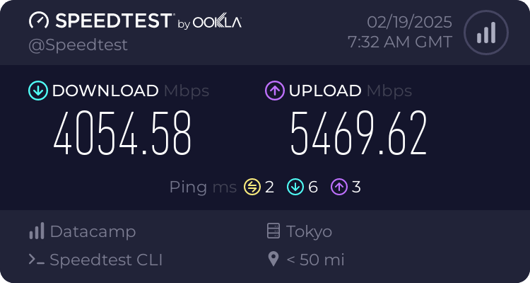 Tokyo, JP 6371.21 Mbps 3665.86 Mbps 1.45 ms
