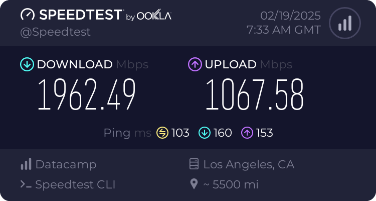 Shanghai, CN 2.83 Mbps 940.59 Mbps 153.52 ms
